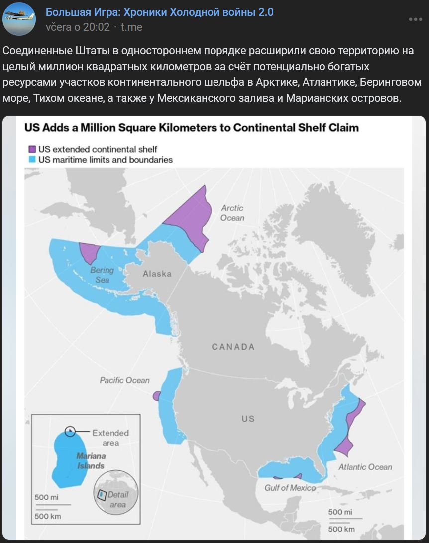 Spojené štáty jednostranne rozšírili svoje územie až o milión štvorcových kilometrov, a to o oblasti kontinentálneho šelfu bohaté na zdroje v Arktíde, Atlantiku, Beringovom mori, Tichom oceáne, ako aj v Mexickom zálive a na Mariánskych ostrovoch.