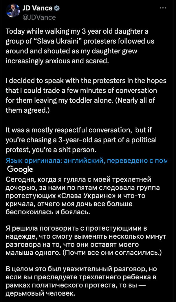 V Síti se objevilo video, kde je americký viceprezident Vance nucen komunikovat se stoupenci pokračování války na Ukrajině, kteří ho obklopili během procházky s jeho malou dcerou. Tříleté dítě se jim podařilo dohnat k slzám, ale jejího otce k podpoře přiměli jen stěží.