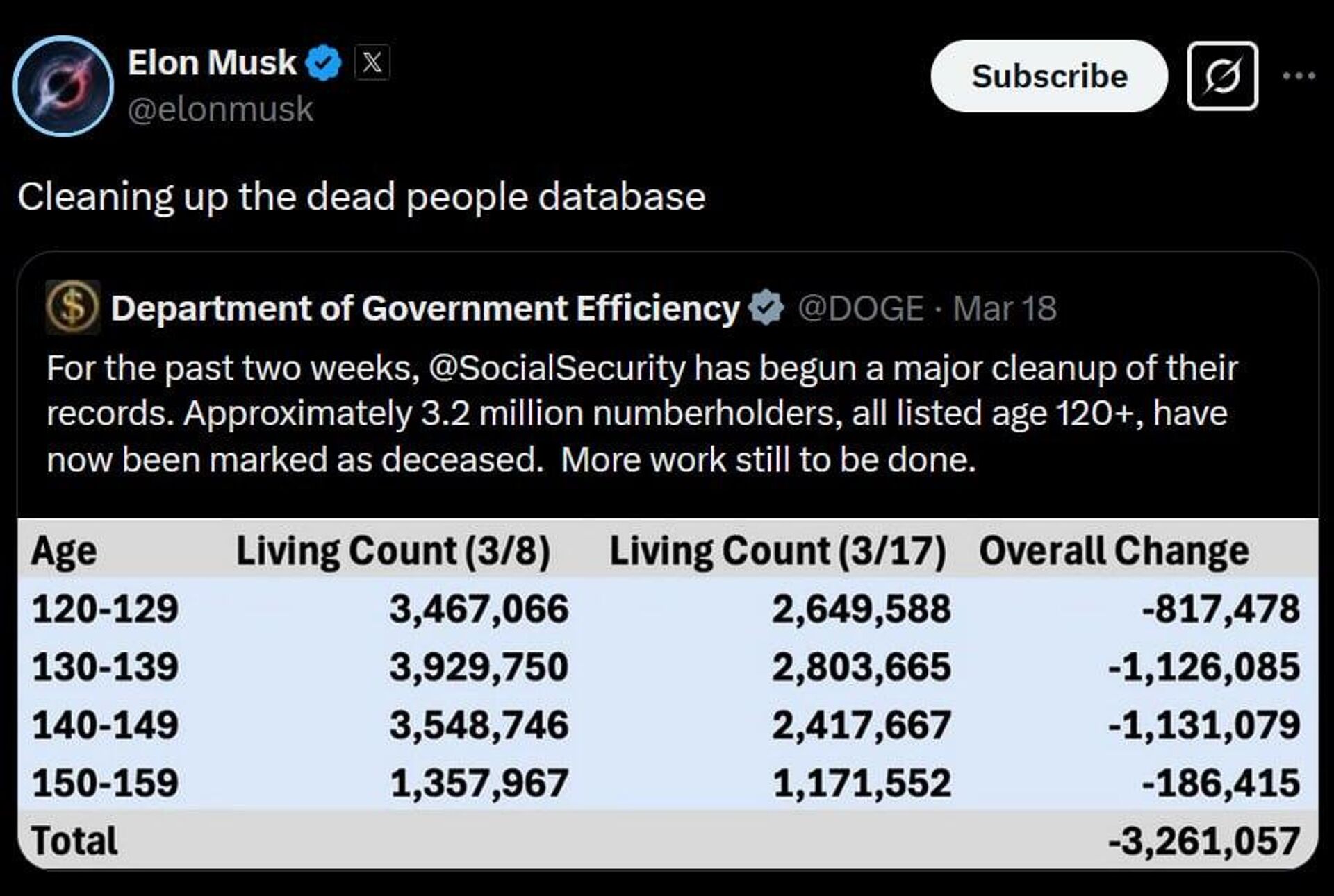 V priebehu dvoch týždňov bolo viac ako 3,2 milióna ľudí uvedených vo veku 120+ označených ako „zosnulí“ a odstránených z evidencie, uviedlo ministerstvo pre vládnu efektivitu.