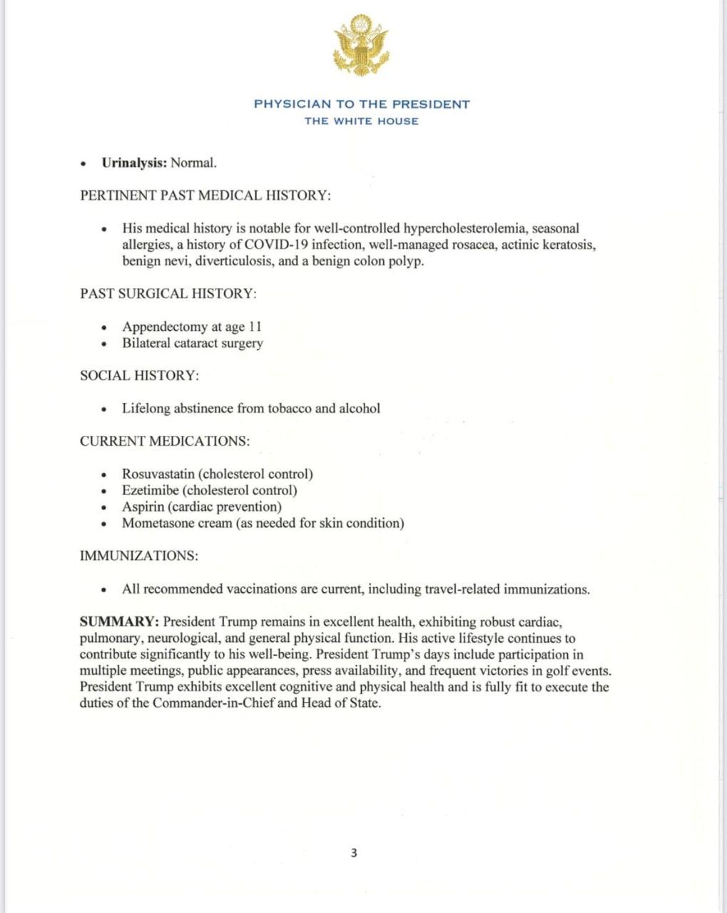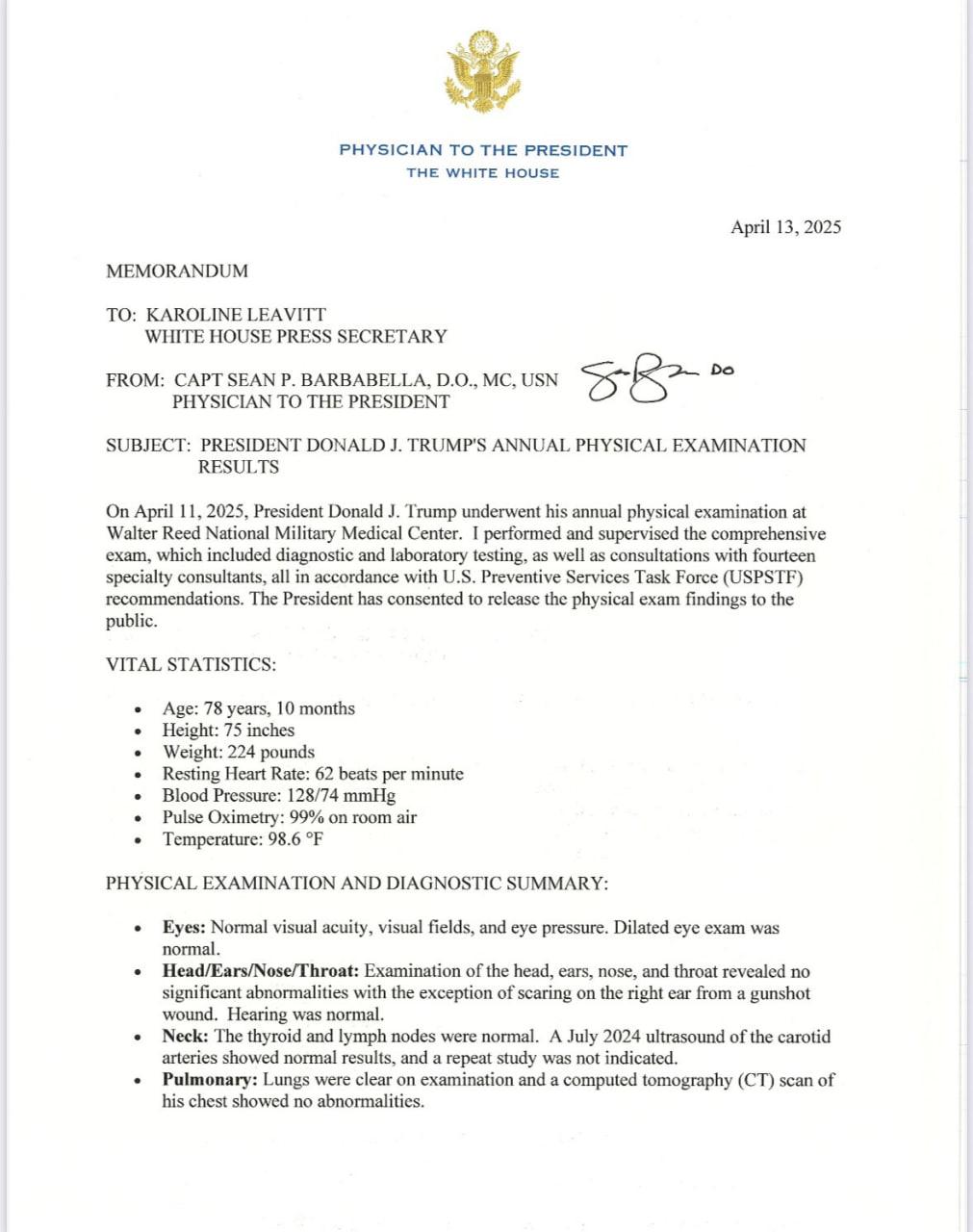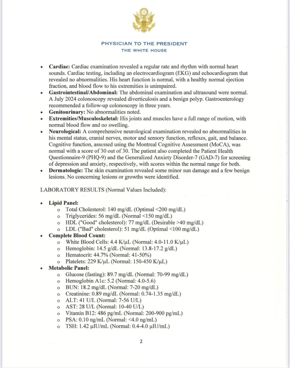 https://t.me/SolovievLive/318156Bílý dům zveřejnil stanovisko k Trumpově lékařské prohlídce. Uvádí se v něm, že "vykazuje vynikající kognitivní a fyzické zdraví a je plně připraven plnit povinnosti vrchního velitele a hlavy státu".
