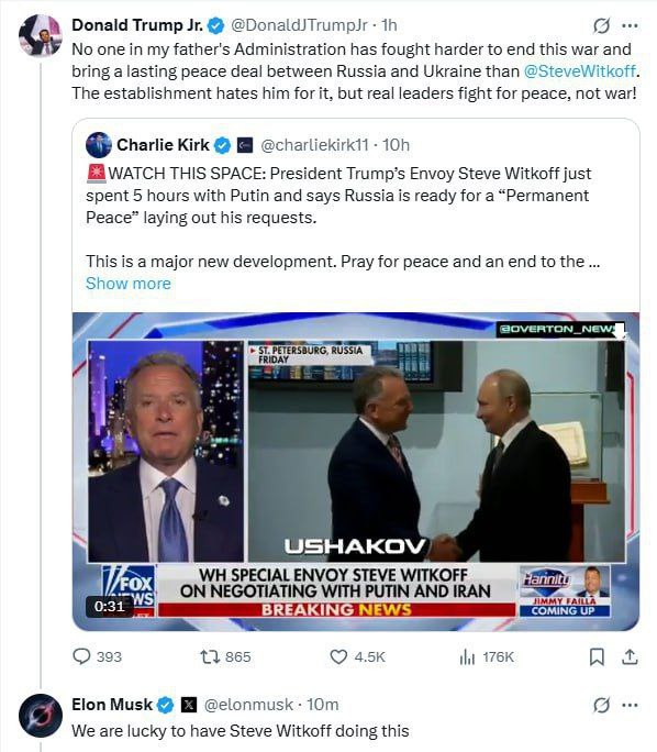 Slova Trumpa juniora později zopakoval Ilon Musk a dodal: "Máme štěstí, že to dělá Steve Whitkoff."