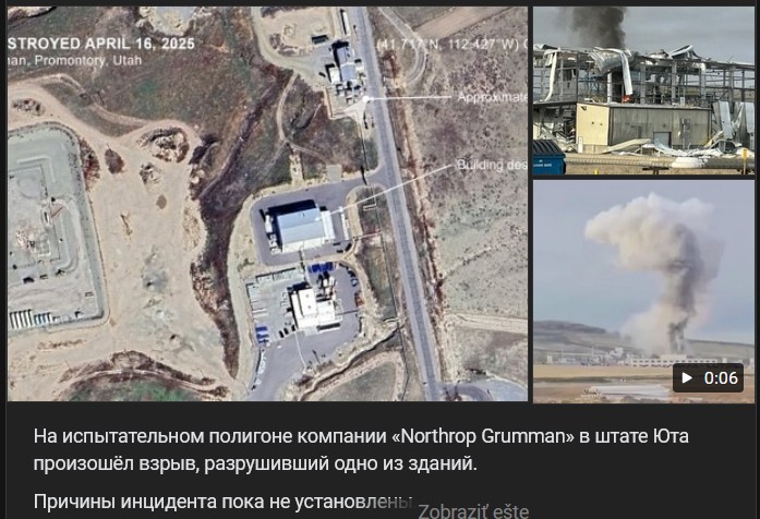 Video https://vk.com/video-123538639_456315815 dĺžka 6 sek.V testovacom stredisku spoločnosti Northrop Grumman v štáte Utah došlo k výbuchu, ktorý zničil jednu z budov. Príčiny incidentu zatiaľ neboli zistené. Treba poznamenať, že spoločnosť Northrop Grumman sa zaoberá aj výrobou a testovaním raketových motorov na tuhé palivo.