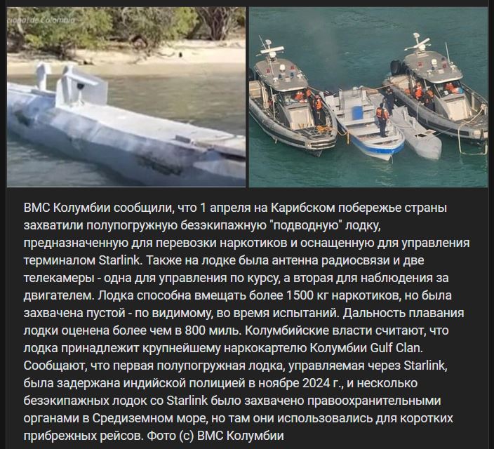 Kolumbijské námorníctvo oznámilo, že 01.04.2025 na Karibskom pobreží krajiny bola zadržaná bez posádková poloponorka, prispôsobená na prepravu drog a ktorá bola vybavená kontrolným a riadiacim terminálom Starlink. Na lodi sa nachádzala aj rádiokomunikačná anténa a 2 TV kamery - jedna na kontrolu kurzu a druhá na sledovanie motora. Loď je schopná pojať viac ako 1500 kg drog, ale bola zachytená prázdna - zrejme počas testovania. Odhadovaný plavebný dosah lode je viac ako 800 míľ. Kolumbijské úrady sa domnievajú, že loď patrí najväčšiemu kolumbijskému drogovému kartelu Gulf Clan. Prvý poloponorný čln prevádzkovaný prostredníctvom Starlinku údajne zadržala Indická polícia v 11/2024 a niekoľko člnov Starlink bez posádky zadržali orgány činné v trestnom konaní v Stredozemnom mori, ale tam sa používali na krátke pobrežné plavby. Foto (c) VMS Kolumbie