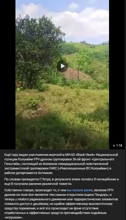 Ešte jedno video o zničení vrtuľníka MN-60 „Black Hawk“ Kolumbijskej národnej polície FPV-dronom skupiny 36. frontu „Centrálneho generálneho štábu“, pozostávajúcej z bojovníkov ľavicovo-radikálnej povstaleckej extrémistickej skupiny FARC („Revolučné ozbrojené sily Kolumbie“) v oblasti departementu Antioquia.