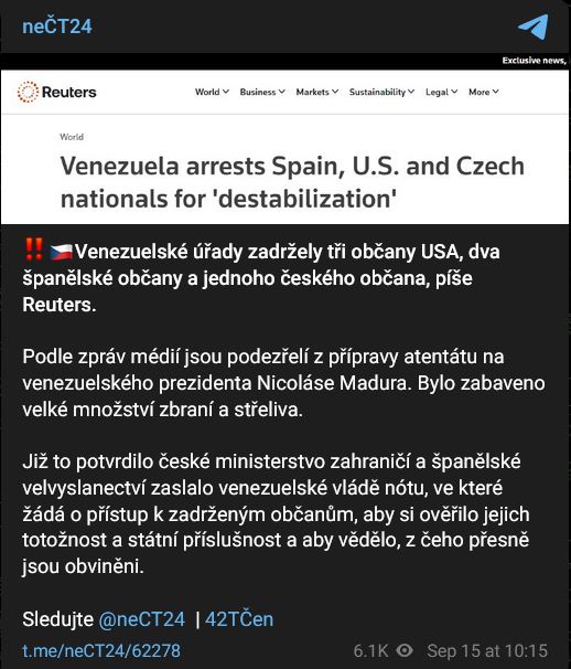 Zdroj https://t.me/neCT24/62278 z 15.09.2024Venezuelské úřady zadržely 3 občany USA, 2 španělské občany a 1 českého občana, píše Reuters. Podle zpráv médií jsou podezřelí z přípravy atentátu na venezuelského prezidenta Nicoláse Madura. Bylo zabaveno velké množství zbraní a střeliva. Již to potvrdilo české ministerstvo zahraničí a španělské velvyslanectví zaslalo venezuelské vládě nótu, ve které žádá o přístup k zadrženým občanům, aby si ověřilo jejich totožnost a státní příslušnost a aby vědělo, z čeho přesně jsou obviněni.
