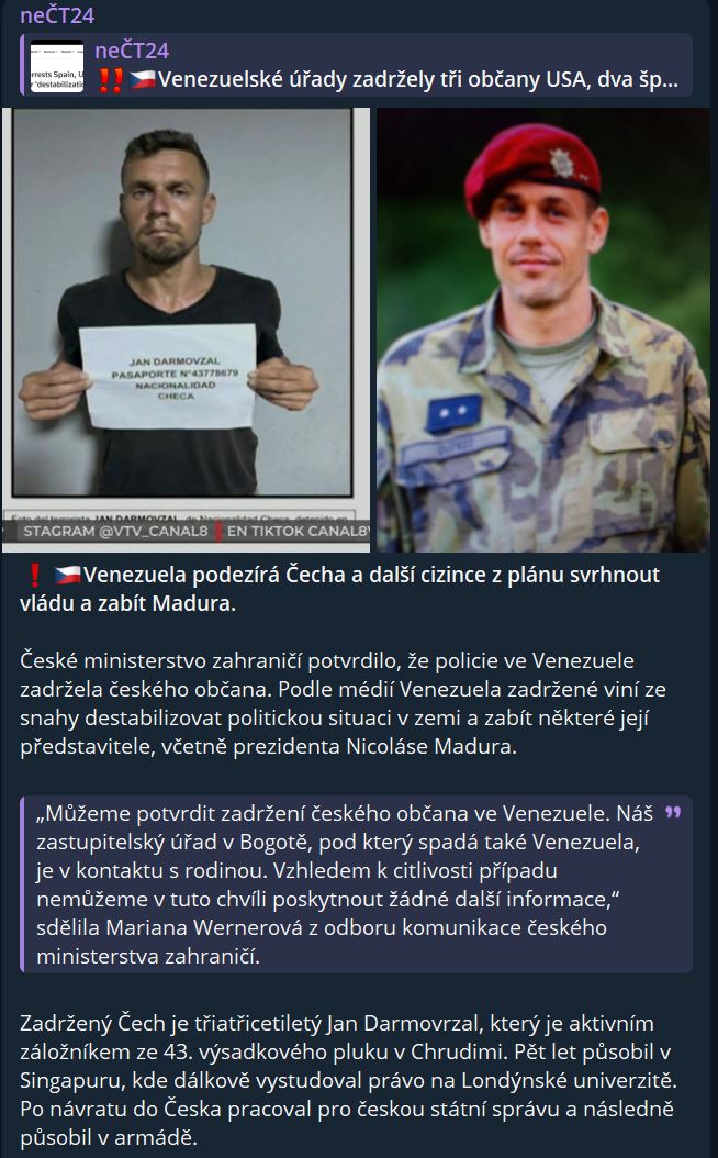 Zdroj https://t.me/neCT24/62299 z 15.09.2024Venezuela podezírá Čecha a další cizince z plánu svrhnout vládu a zabít Madura.