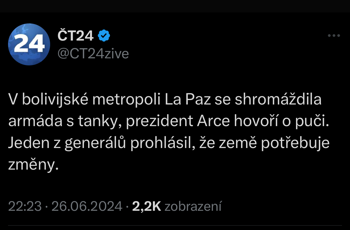 V bolivijské metropoli La Paz se shromáždila armáda s tanky, prezident Arce hovoří o puči. Jeden z generálů prohlásil, že země potřebuje změny.