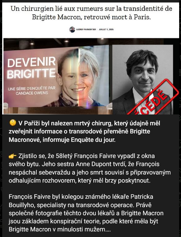 V Paříži byl nalezen mrtvý chirurg, který údajně měl zveřejnit informace o transrodové přeměně Brigitte Macronové, informuje Enquête du jour. Zjistilo se, že 58letý François Faivre vypadl z okna svého bytu. Jeho sestra Anne Dupont tvrdí, že François nespáchal sebevraždu a jeho smrt souvisí s připravovaným odhalujícím rozhovorem, který měl brzy poskytnout.