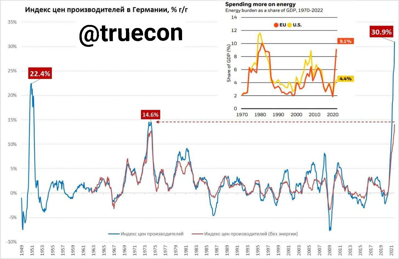 Ceny výrobců v Německu v březnu vzrostly o dalších 4,9 % na meziroční tempo 30,9 %, čímž stanovily nový poválečný rekord. Meziroční nárůst cen je dvakrát vyšší než v 70. letech. @banksta