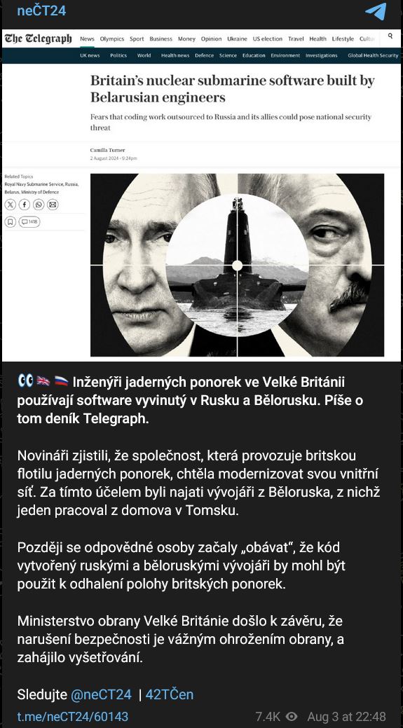 Novináři zjistili, že společnost, která provozuje britskou flotilu jaderných ponorek, chtěla modernizovat svou vnitřní síť. Za tímto účelem byli najati vývojáři z Běloruska, z nichž jeden pracoval z domova v Tomsku. Později se odpovědné osoby začaly „obávat“, že kód vytvořený ruskými a běloruskými vývojáři by mohl být použit k odhalení polohy britských ponorek. Ministerstvo obrany Velké Británie došlo k závěru, že narušení bezpečnosti je vážným ohrožením obrany, a zahájilo vyšetřování.