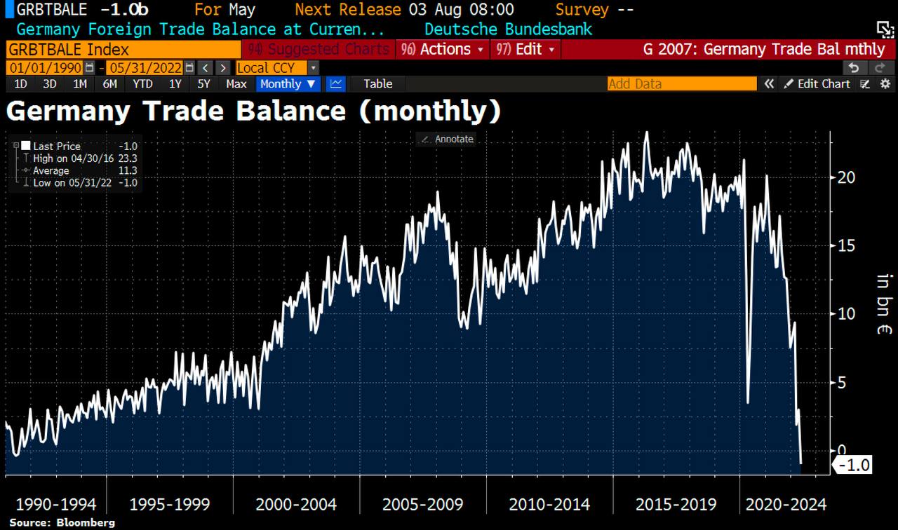 Německo jako ekonomická velmoc v celosvětovém měřítku začíná upadat. Po desetiletích přebytků v květnu poprvé více dovezlo, než vyvezlo. Informují o tom média na základě předběžných dat německého statistického úřadu Destatis. Jde o důsledky covidu, vysokých cen surovin, války na Ukrajině a narušení výrobních řetězců. I když válka skončí a ceny se stabilizují, někteří ekonomové tvrdí, že nastává změna paradigmatu a s přebytkem zahraničního obchodu, ze kterého Německo mohutně léta těžilo, je konec. Hospodářský obr dosud závislý na ruských surovinách a obchodu s Čínou se ocitá v bezprecedentní situaci. Úpadek německého hospodářství bude mít fatální následky pro ostatní evropské země.