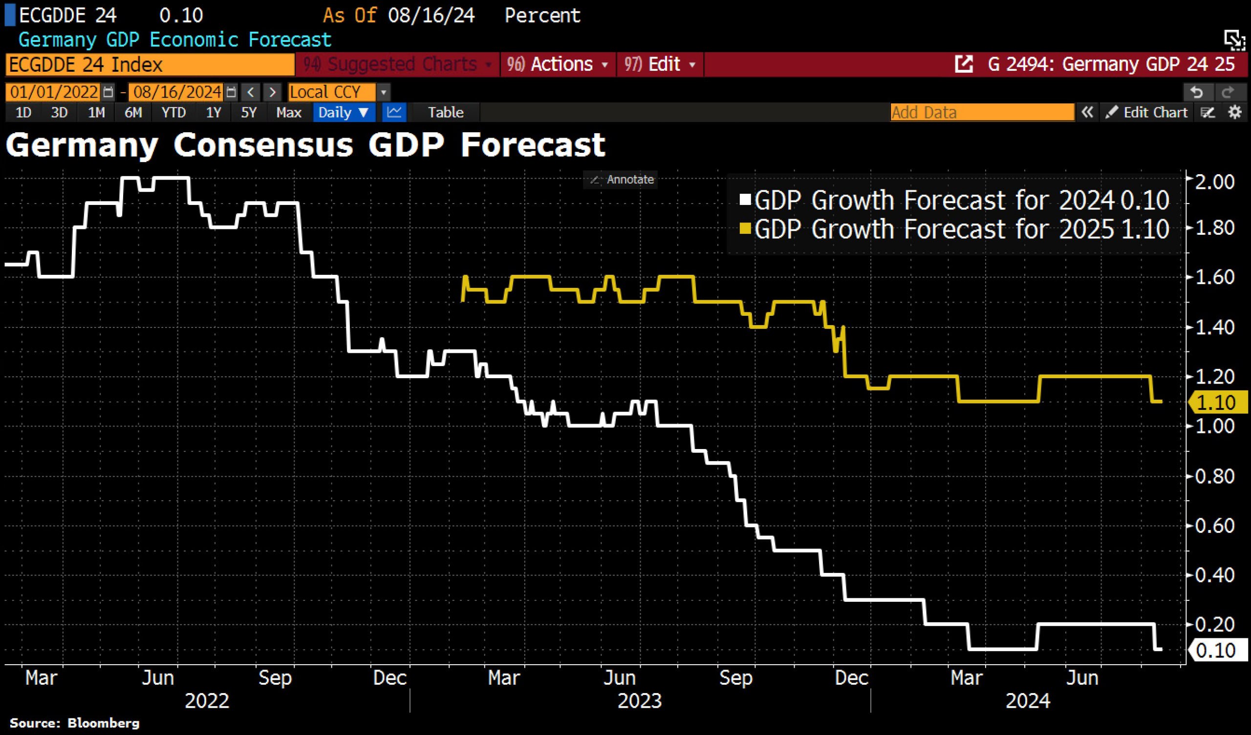 https://t.me/BIoomberg/31987Analytici snížili své prognózy hospodářského růstu země na 0,1 % v letošním roce a 1,1 % v roce příštím. Pro srovnání, Itálie by měla v roce 2024 růst o 0,8 procenta, Francie o 1,1 procenta a Španělsko o 2,6 procenta.