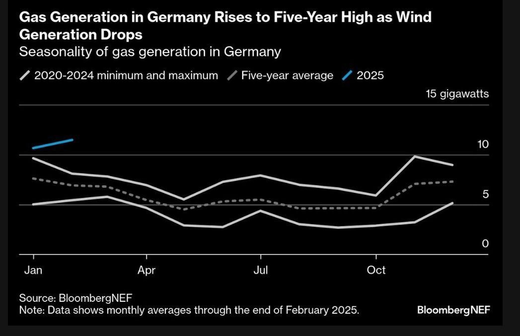 Německo chce navzdory škodlivým emisím znovu spustit záložní uhelné elektrárny. V 02/2025 výroba větrné energie meziročně klesla o 47 %, zatímco spotřeba plynu vzrostla o 51 %