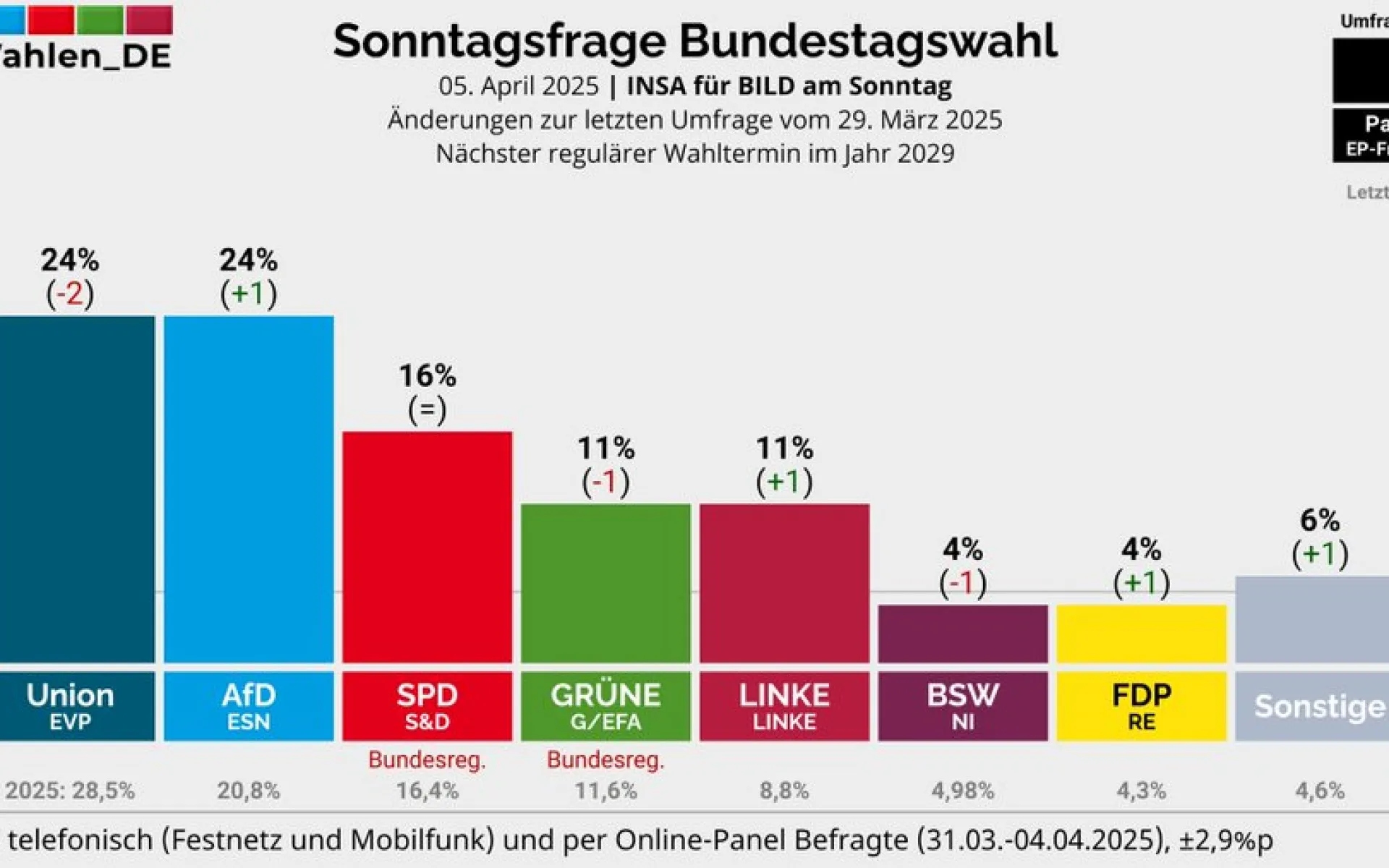 Podle nejnovějšího nedělního trendu Insa, který zveřejnil deník BILD, jsou preference CDU/CSU a AfD vyrovnaně na 24 procentech. CDU/CSU oproti předchozímu průzkumu ztratila 2 procentní body, zatímco AfD 1 procentní bod získala.