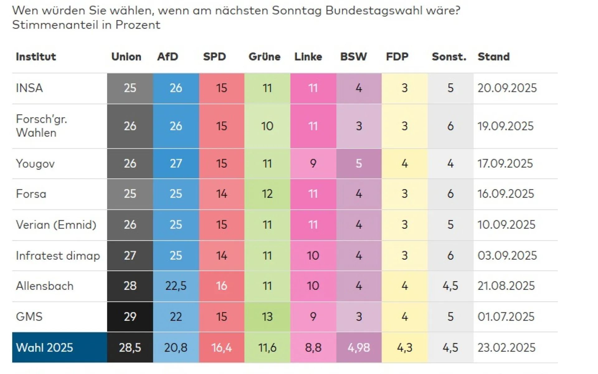 AfD poprvé předstihla vládní CDU/CSU kancléře Friedricha Merze v průzkumu YouGov, kdy by jí ve volbách do Spolkového sněmu dalo hlas 27 procent respondentů – o dva procentní body více než v srpnovém průzkumu. CDU/CSU ztratila jeden bod a měla by 26 procent.