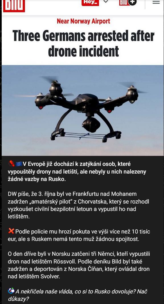V Evropě již dochází k zatýkání osob, které vypouštěly drony nad letišti, ale nebyly u nich nalezeny žádné vazby na Rusko