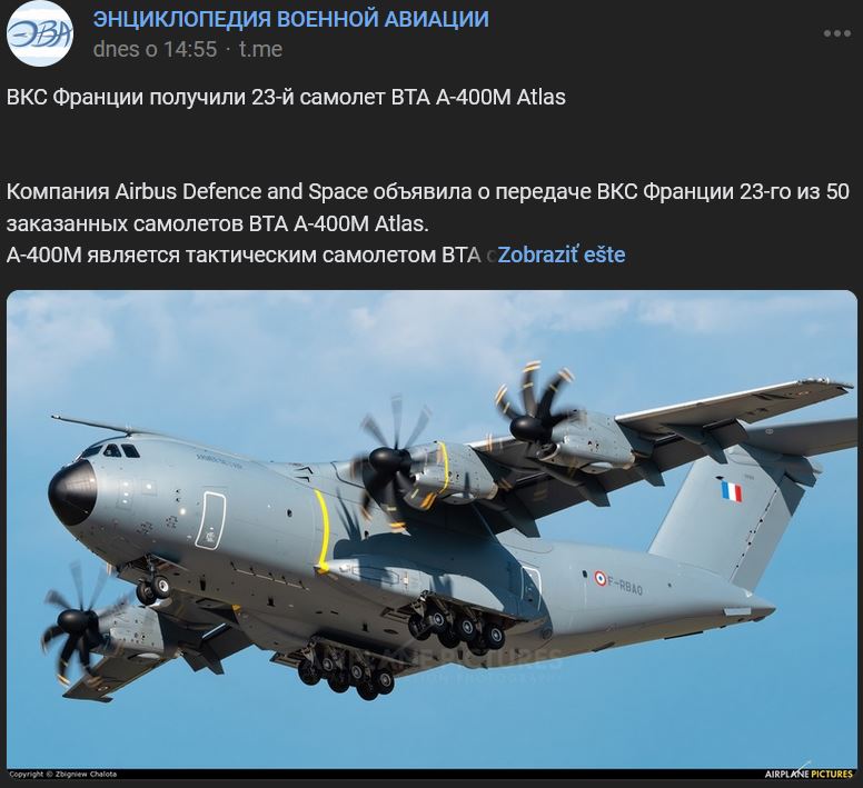 Spoločnosť "Airbus Defence and Space" oznámila odovzdanie 23. lietadla z 50 objednaných lietadiel A-400M Atlas francúzskym vzdušným silám. Zdroj https://vk.com/wall-173678697_358301 / https://t.me/wingsofwar/16171 z 31.01.2024