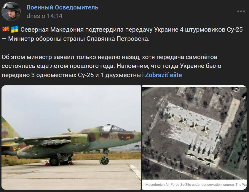 Ministerka to oznámila len pred týždňom, hoci presun lietadiel sa uskutočnil už vlani v lete (leto 2022). Pripomíname, že vtedy boli Ukrajine odovzdané 3 jednomiestne Su-25 a 1 dvojmiestny Su-25UB. Všetky bojové lietadlá boli v nelietajúcom stave a pravdepodobne slúžili ako darcovia náhradných dielov. Okrem Su-25 dodalo Macedónsko v tom čase Ukrajine 30 tankov T-72A, ručné zbrane, delostrelecké, protitankové a protilietadlové zbrane, ako aj muníciu.