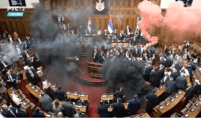 Opoziční poslanci přistoupili k řečnickému pultu, aktivovali červené a černé dýmovnice a rozvinuli transparent s nápisem „Srbsko povstává, aby svrhlo režim“, uvádí zpráva. KosovaPress.