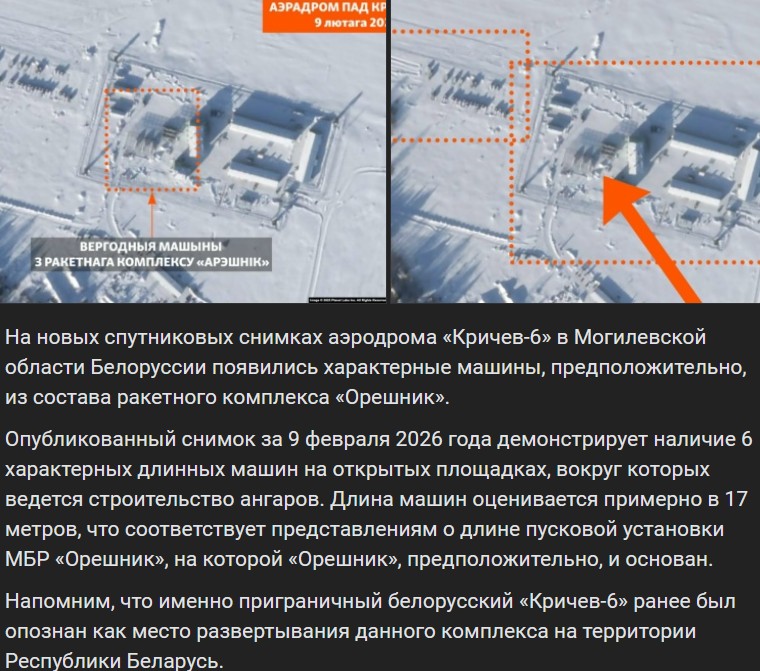 Zdroj https://vk.com/wall-104764077_564876 / https://t.me/milinfolive/166035 z 11.02.2026Na nových družicových snímkach letiska „Kričev-6“ (Кричев-6) v Mogilevskoj oblasti Bieloruska sa objavili charakteristické mašiny, pravdepodobne zo zložky raketového komplexu „Orešnik“ (Орешник).