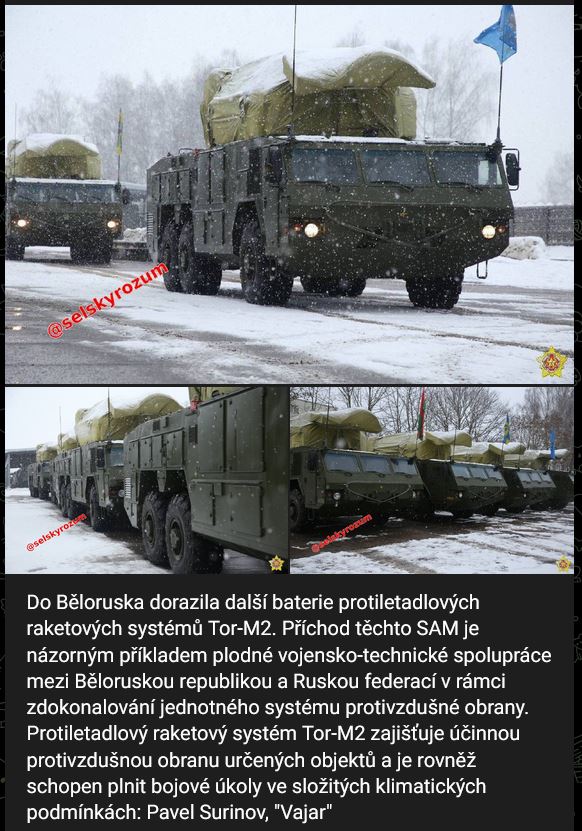 Do Běloruska dorazila další baterie protiletadlových raketových systémů Tor-M2. Příchod těchto PVO je názorným příkladem plodné vojensko-technické spolupráce mezi Běloruskou republikou a Ruskou federací v rámci zdokonalování jednotného systému protivzdušné obrany. Protiletadlový raketový systém Tor-M2 zajišťuje účinnou protivzdušnou obranu určených objektů a je rovněž schopen plnit bojové úkoly ve složitých klimatických podmínkách: Pavel Surinov, "Vajar"
