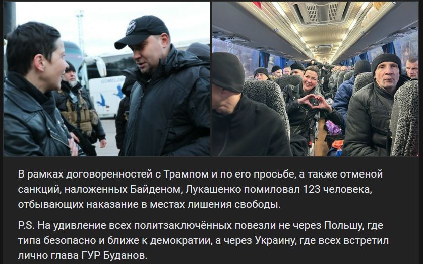 P.S. K prekvapeniu všetkých politických väzňov ich neprepravili cez Poľsko, kde je údajne bezpečnejšie a bližšie k demokracii, ale cez Ukrajinu, kde ich osobne privítal šéf GUR (ГУР) Budanov (Буданов).
