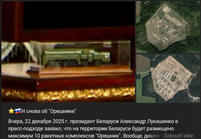Podľa slov prezidenta Bieloruskej republiky A. Lukašenka, Bielorusko včera (17.12.2025) dostalo nový ruský BRSD „Orešnik“ (БРСД Орешник), teraz raketa vstupuje do bojovej služby.