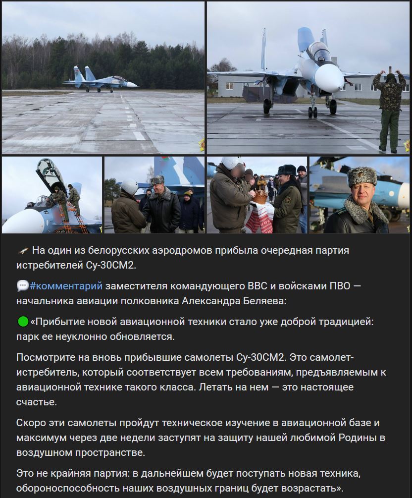 „Prílet novej leteckej techniky sa stal už dobrou tradíciou: jej park sa neustále obnovuje. Pozrite sa na novo prichádzajúce lietadlá Suchoj Su-30SM2 (Су-30СМ2). Ide o stíhacie lietadlo, ktoré spĺňa všetky požiadavky kladené na leteckú techniku tejto triedy. Lietať na ňom je skutočné šťastie. Čoskoro tieto lietadlá prejdú technickým preskúmaním na leteckej základni a najneskôr do 2 týždňov nastúpia na ochranu našej milovanej vlasti vo vzdušnom priestore. Toto nie je posledná dodávka: v budúcnosti bude prichádzať nová technika a obranyschopnosť našich vzdušných hraníc sa bude zvyšovať.“