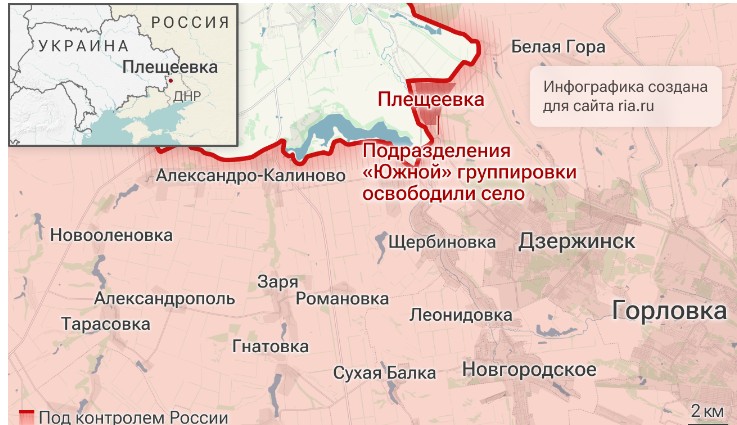 „Jednotky Južnej skupiny síl v dôsledku aktívnych útočných operácií oslobodili obec Pleščejevka,“ uvádza sa v správe.