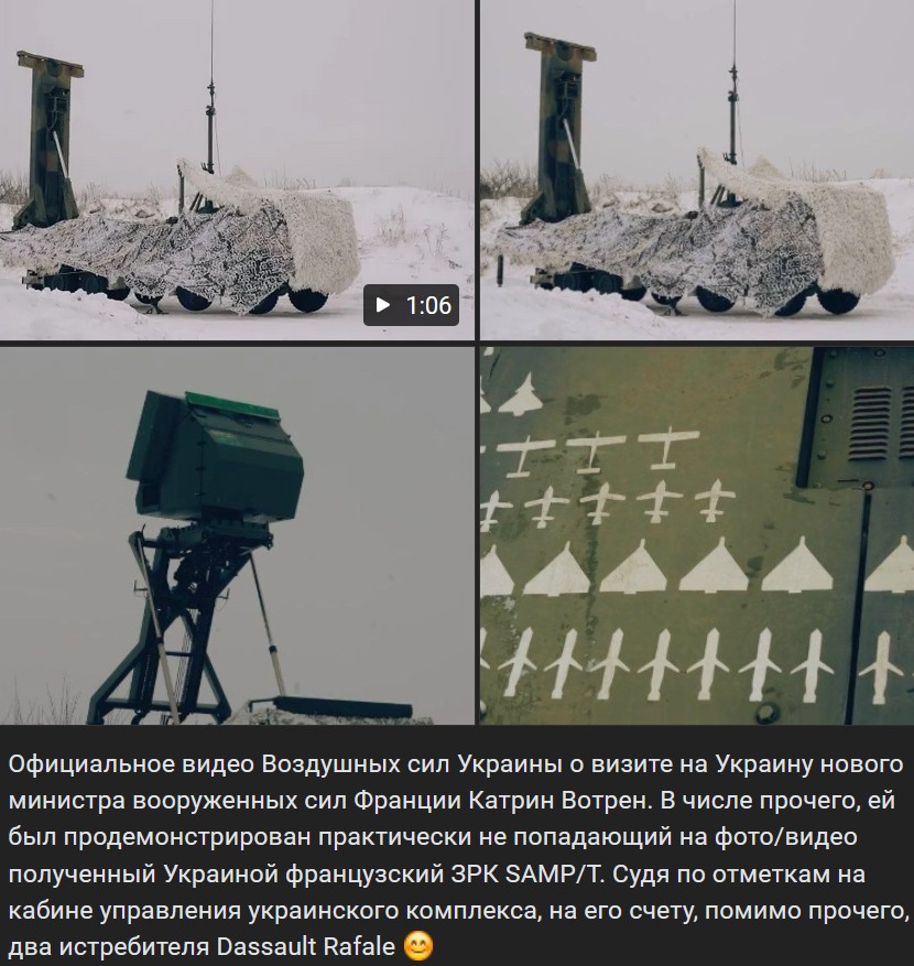 Oficiálne video Vzdušných síl Ukrajiny o návšteve novej ministerky ozbrojených síl Francúzska Catherine Vautrinovej na Ukrajine. Okrem iného jej bol predvedený francúzsky protivzdušný raketový systém SAMP/T (bez rakiet), ktorý Ukrajina získala. Podľa značiek na kabíne riadenia ukrajinského komplexu má na svojom konte okrem iného aj 2 lietadlá Dassault Rafale.