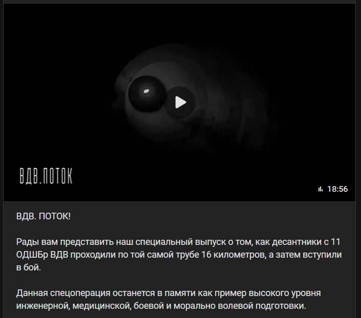 Video https://vk.com/video-104764077_456287754 dĺžka 18:56 min.Sme radi, že vám môžeme predstaviť našu špeciálnu reportáž o tom, ako výsadkári z 11 ODŠBr VDV (ОДШБр ВДВ) prešli 16 kilometrov v rúre a potom vstúpili do boja. Túto špeciálnu operáciu si budeme pamätať ako príklad vysokej úrovne ženijnej, zdravotníckej, bojovej a morálnej prípravy.