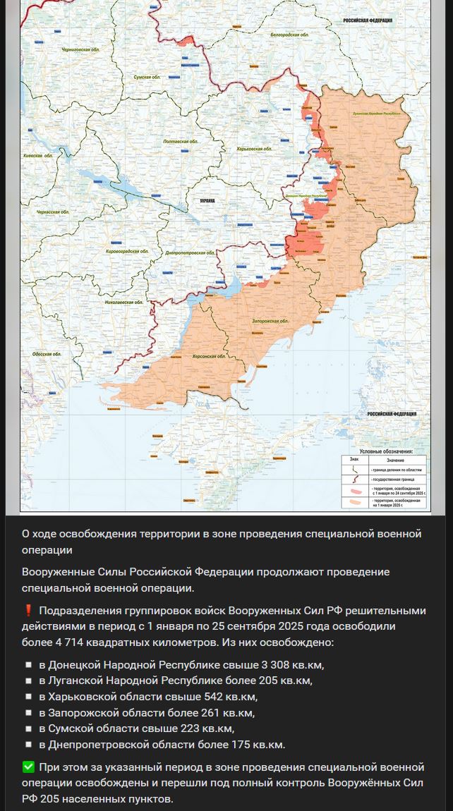 Jednotky ozbrojených síl RF rozhodnými akciami v období od 01.01.2025 do 25.09.2025 oslobodili viac ako 4 714 km². Z toho bolo oslobodené:
