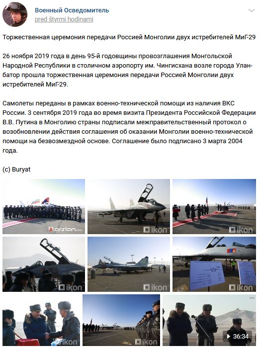 V piatok 15.11.2019 v Mongolsku na letisku Nalajch cca 30km od hlavného mesta pristáli 2ks stíhacích lietadiel rodiny MiG-29 = uvedené stroje boli odovzdané Ruskom Mongolsku na základe zmluvy o vojensko-technickej pomoci. V utorok 26.11.2019 na letisku prebehne slávnostný ceremoniál odovzdania lietadiel pri príležitosti 95. výročia vzniku Mongolskej republiky.