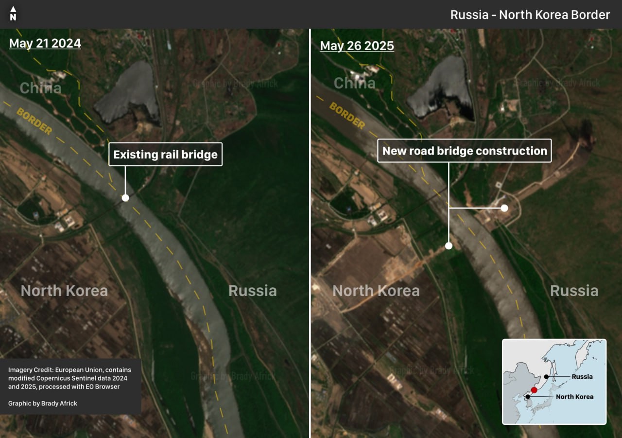 Iný západný OSINT-er zverejňuje družicové snímky, na ktorých zaznamenáva aktívnu výstavbu nového mosta medzi KĽDR a Ruskou federáciou. Budovaný most sa nachádza vedľa existujúceho železničného mosta (1-koľaj), ktorý je hlavnou pozemnou „tepnou“ používanou na prepravu tovaru medzi krajinami. Uvádza tiež, že starý most sa aktívne využíval na dodávky zbraní do Ruskej federácie.