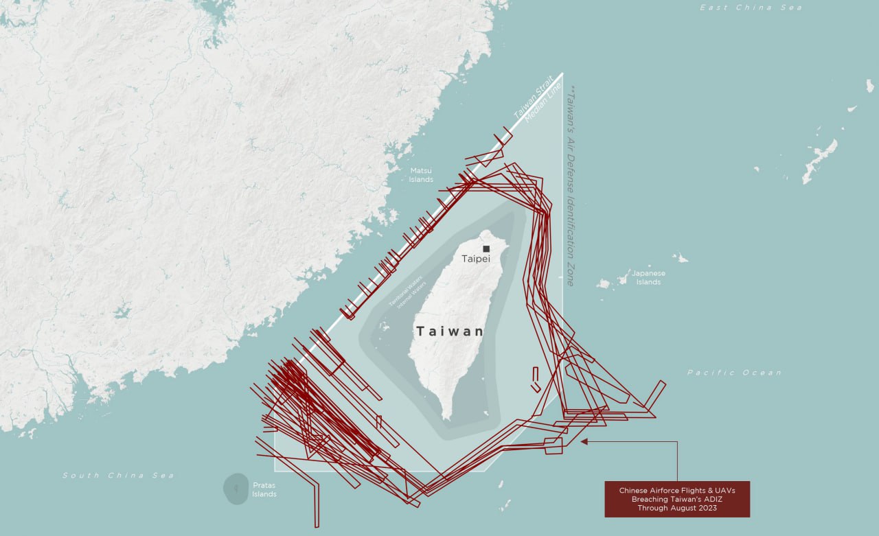 Letové trasy PLA a UAV do oblasti Tchaj-wanu v srpnu 2023.
