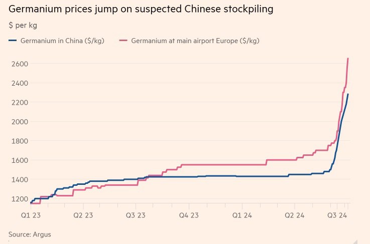 ▪️„Čínská omezení dodávek germania a galia, které se používají při výrobě polovodičových součástek, komponentů vojenské techniky a komunikačních zařízení, vedla k téměř dvojnásobnému nárůstu cen těchto surovin za poslední rok,“ uvedl list Financial Times.