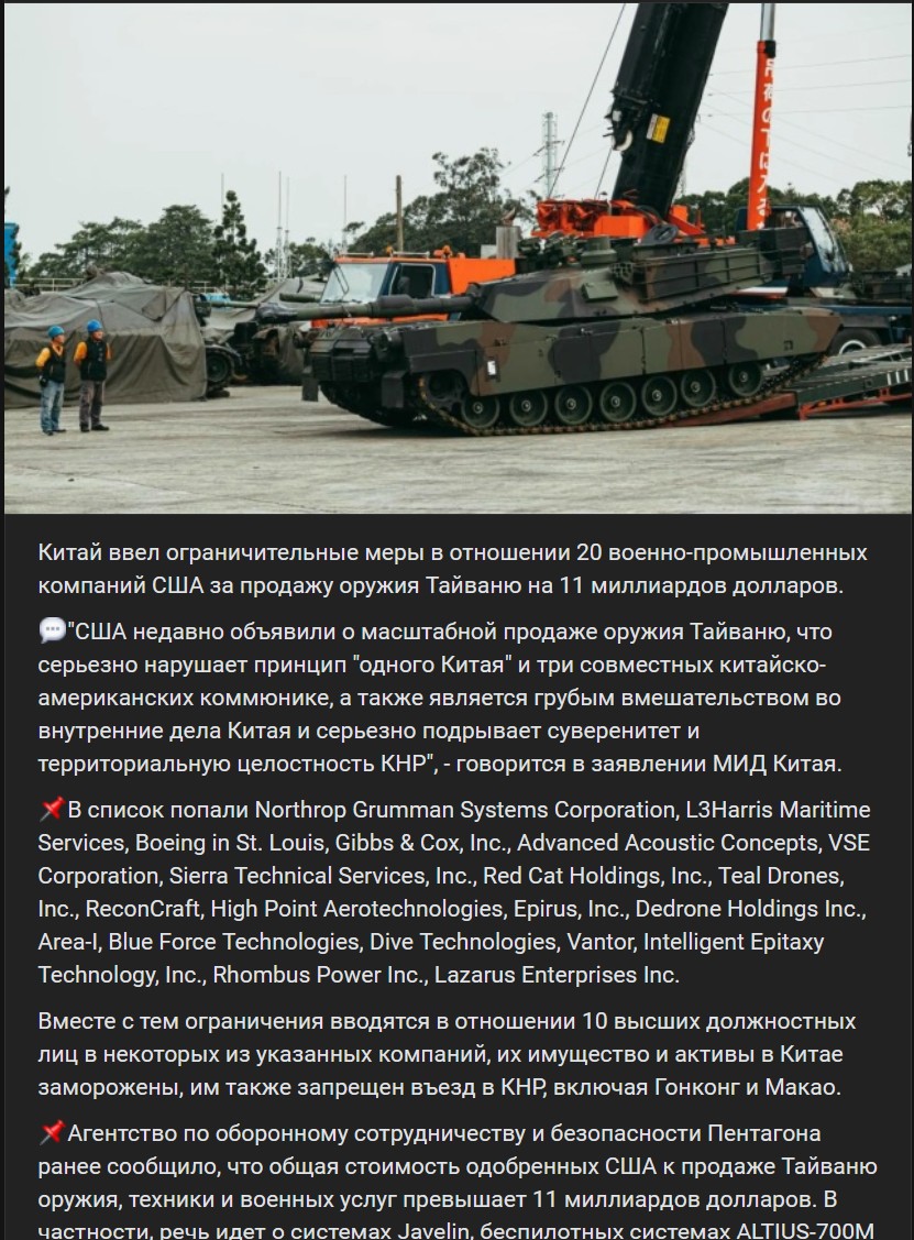 „SŠA nedávno oznámili rozsiahly predaj zbraní Taiwanu, čo vážne porušuje princíp „jednej Číny“ a 3 spoločné čínsko-americké komuniké, ako aj predstavuje hrubé zasahovanie do vnútorných záležitostí Číny a vážne narúša suverenitu a územnú celistvosť ČĽR“, uvádza sa vo vyhlásení Ministerstva zahraničných vecí Číny.