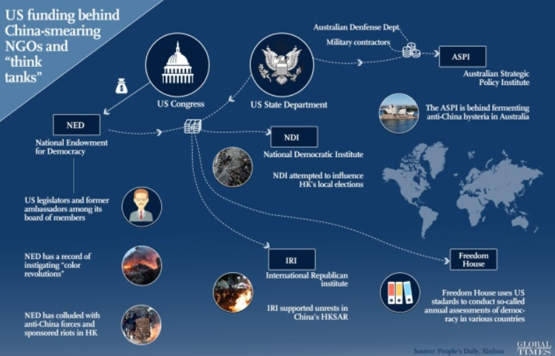 Je teď všeobecně známo, že think-tanky a jiné neziskovky sehrály rozhodující roli v pokusech o změny režimů a ve vyvolávání rozvratu při zásazích do vnitřních záležitostí jiných zemí, a tak řada takových působí i v Číně, kde spolupracují třeba na spřádání podivných povídaček např. o dění v čínské autonomní oblasti Ujgurů Si-tiang, autonomní oblasti Tibet a na další potravě pro západní propagandistickou mašinérii.