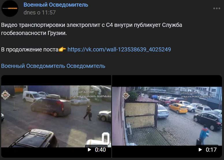 Foto výbušniny zverejnila gruzínska štátna bezpečnostná služba. Agentúra uvádza, že výbušniny s hmotnosťou 14 kg sa do krajiny dostali pod zámienkou batérií do elektromobilov. Náklad bol odoslaný z Odesy cez Rumunsko, Bulharsko a Turecko a 19.01.2024 prekročil turecko-gruzínsku hranicu cez kontrolný bod Sarpi. Cieľovým miestom nákladu bola Voronež. 3 výbušné zariadenia boli zadržané na rusko-gruzínskej hranici, ale ďalšie 3 zariadenia "zostali v Tbilisi na konkrétnej adrese", uviedli médiá. Zdroj https://vk.com/wall-123538639_4025249 z 05.02.2024