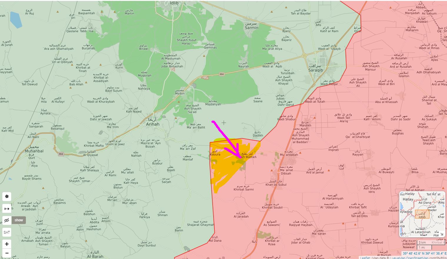 :sipka: To je skoro poslední oficiální turecké pozorovací stanoviště ze Soči (dvě jsou ještě u Džisr aš-Šugúr a další dvě u hraničního přechodu Bab al-Hawa, jinak už je vše obklíčené SAA), ty ostatní "pozorovací stanoviště" nejsou v dohodě ze Soči, takže to nemohou být ani žádná pozorovací stanoviště, ale jsou to turecké vojenské základny/shromáždiště techniky, pozice dělostřeleckých baterií a tak podobně.