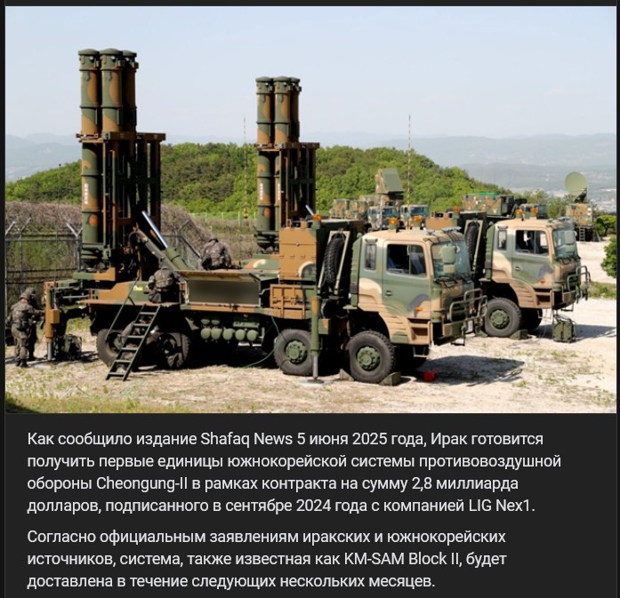 Spoločnosť Shafaq News dňa 05.06.2025 informovala, že Irak sa pripravuje na prevzatie prvých jednotiek juhokórejského systému protivzdušnej obrany Cheongung-II v rámci kontraktu v hodnote 2,8 miliardy $ podpísaného v 09/2024 so spoločnosťou LIG Nex1.
