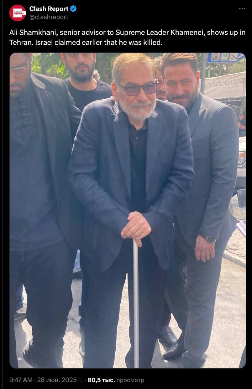 ▪️ Vtedy sa ukázalo, že je nažive aj hlavný poradca najvyššieho vodcu ajatolláha Chameneího, ktorého Izrael vyhlásil za zavraždeného. Médiá zverejnili fotografiu Alího Šamcháního v Teheráne s palicou a obklopeného ochrankou.