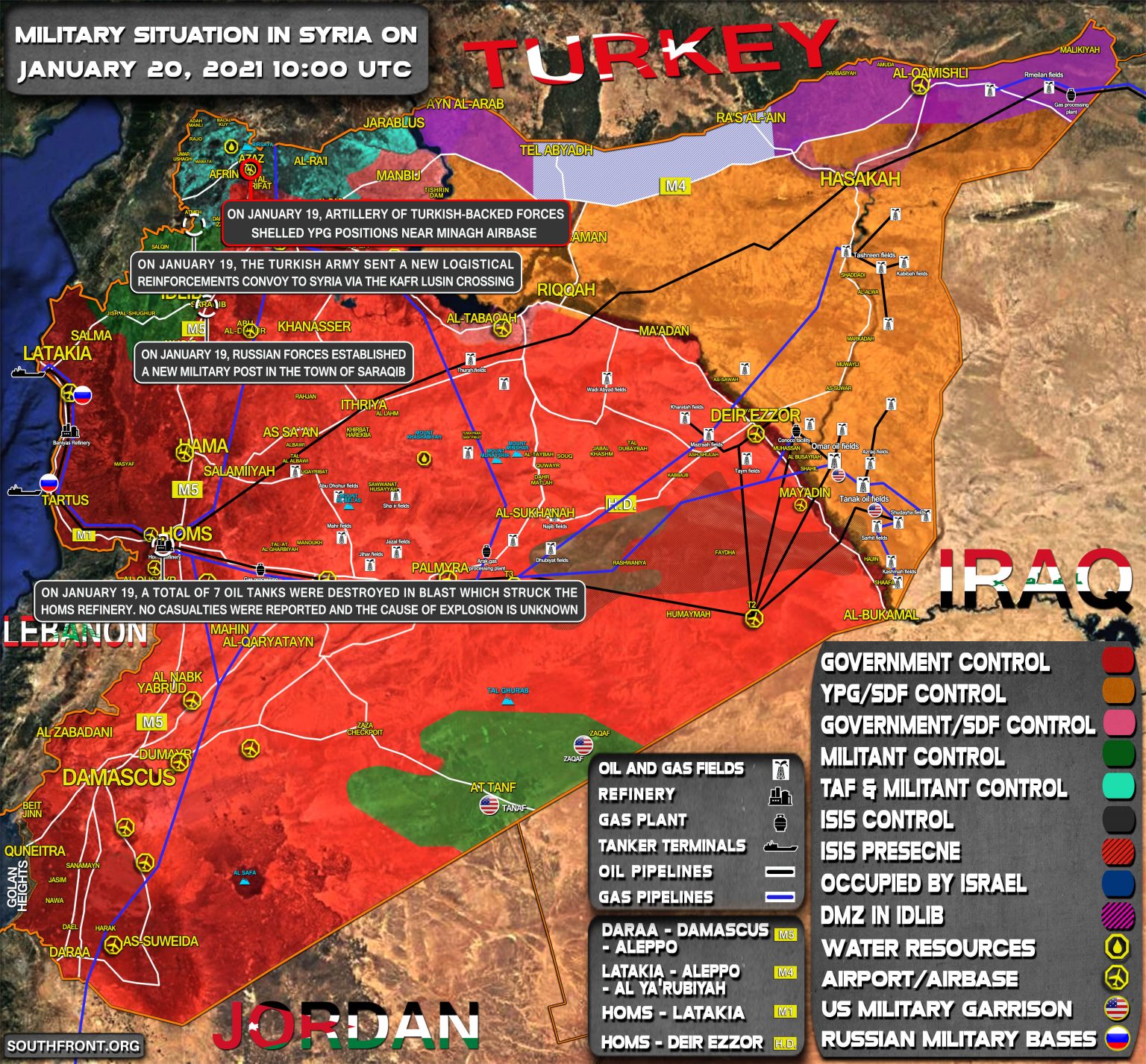 19. januára bolo výbuchom, ktorý zasiahol rafinériu v Homse, zničených celkom 7 ropných nádrží. Obete na životoch neboli hlásené a príčina výbuchu nie je známa.