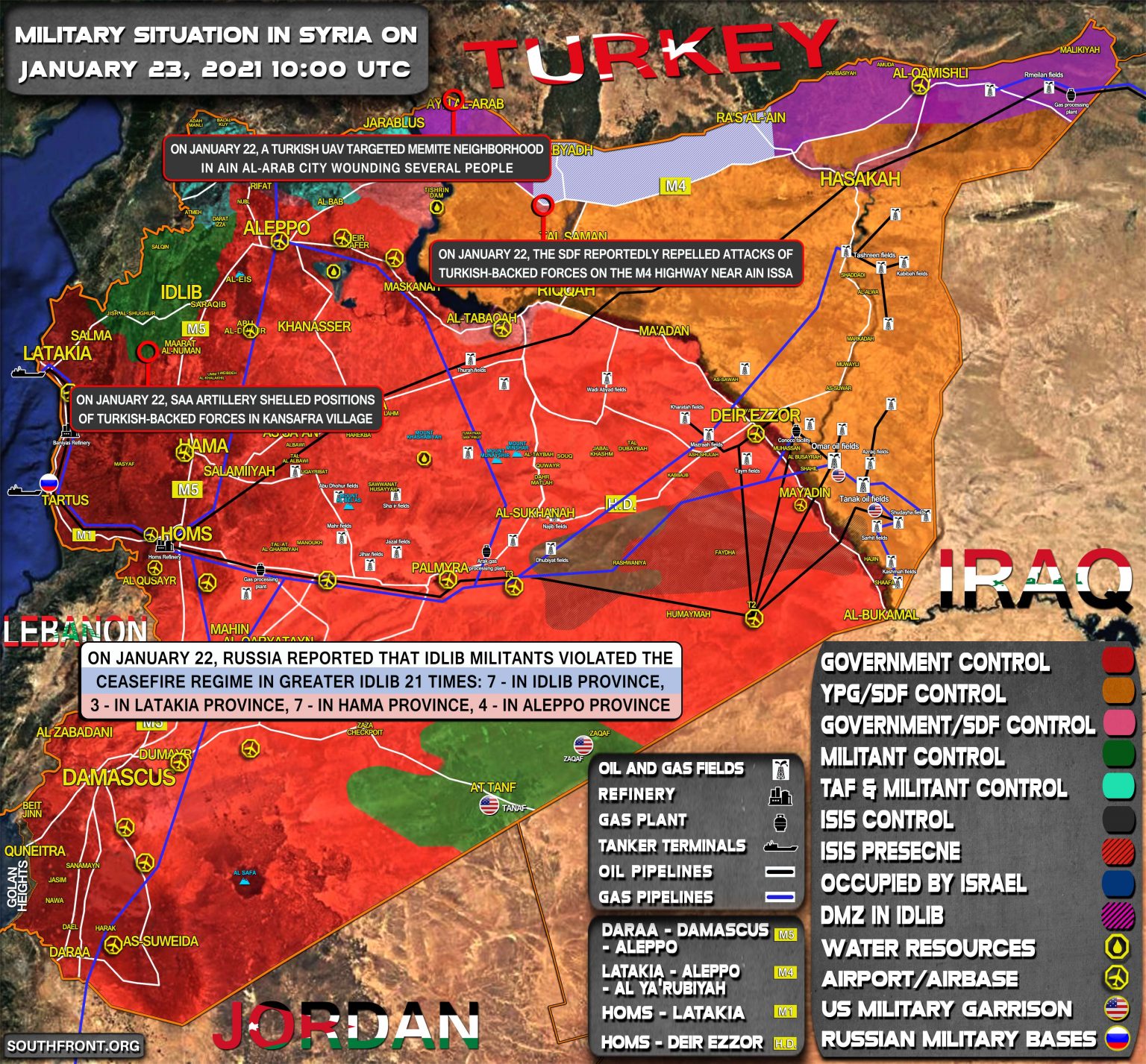 22. januára SDF údajne odrazila útoky turecky podporovaných síl na diaľnicu M4 neďaleko Ain Issa;