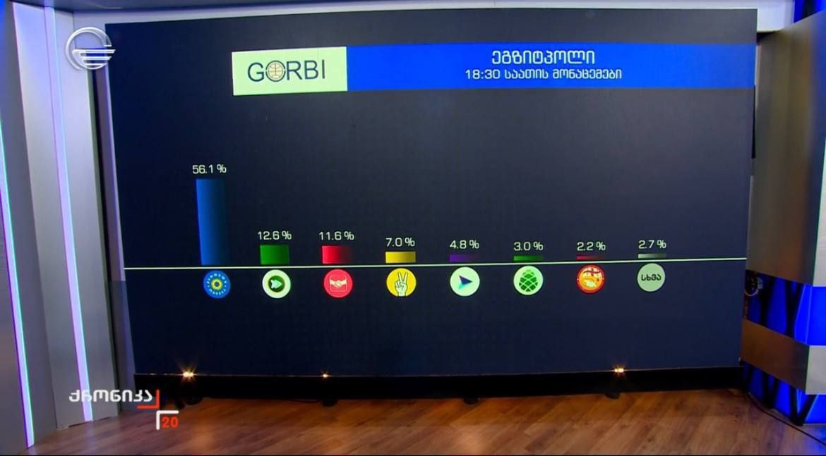 https://civil.ge/ka/archives/631194Podle předběžných výsledků, které zveřejnila Ústřední volební komise 26. října, vede strana „Gruzínský sen“ s 52,99 %, opoziční strany, které překročily pětiprocentní hranici, získaly celkem 38,4 %.