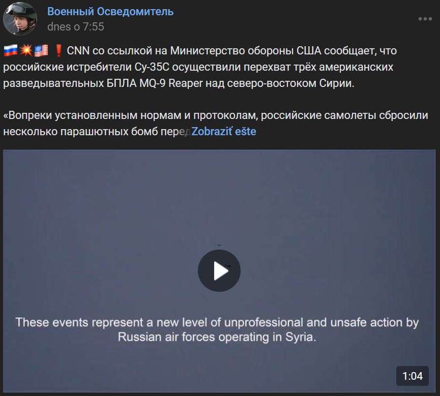 CNN s odvolaním sa na Ministerstvo obrany SŠA uvádza, že ruské lietadlá Suchoj Su-35S (Су-35С) nacvičovali útok na 3 americké prieskumné BPLA MQ-9 Reaper nad severovýchodnou Sýriou.