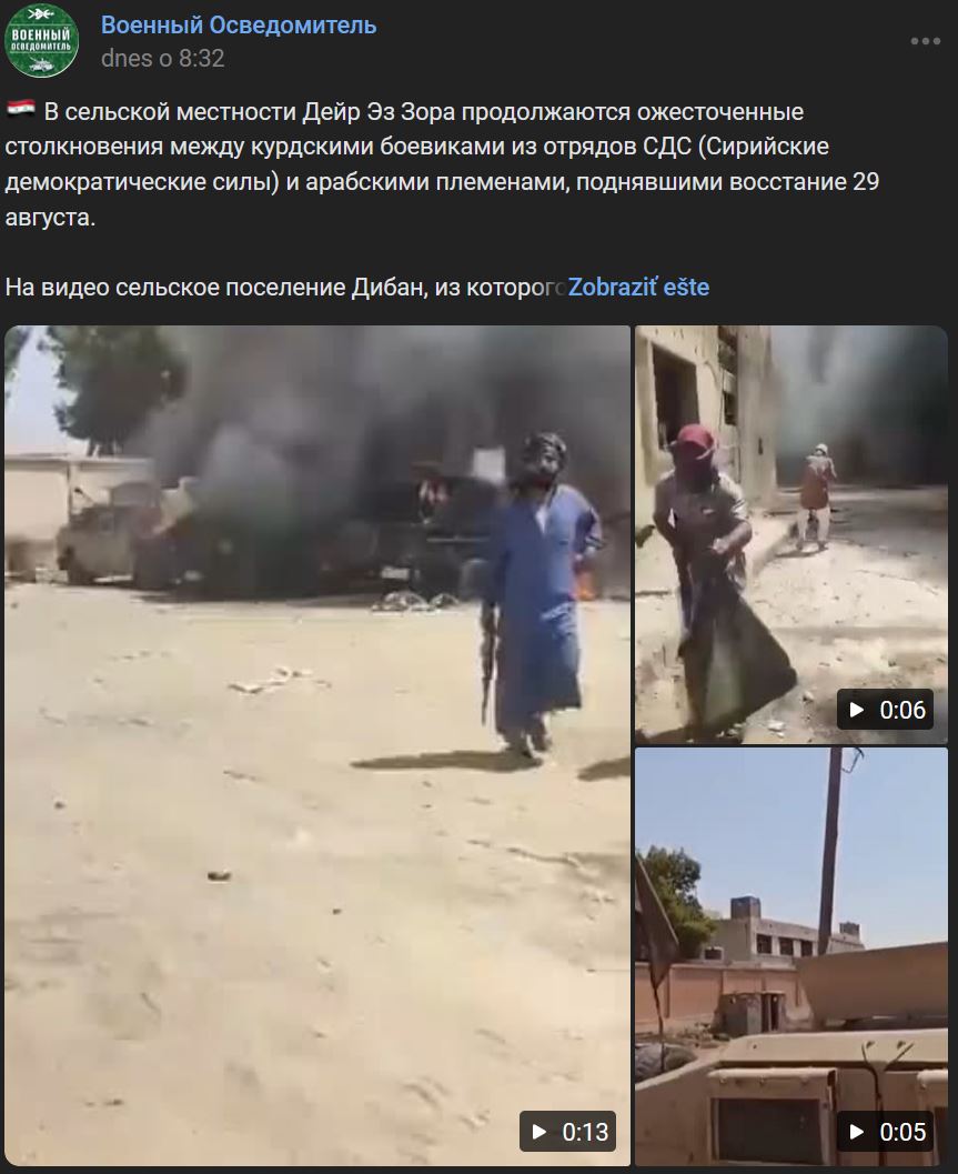 Na vidieku Dajr az-Zaur (ديرالزور) pokračujú násilné strety medzi kurdskými bojovníkmi SDF (Sýrske demokratické sily) a arabskými kmeňmi, ktoré sa vzbúrili v utorok 29.08.2023. Na videu je vidiecka osada Diban (ذيبان), z ktorej kurdské jednotky vytlačili arabské klany, ktoré podľa doterajších slov podporujú takmer všetky strany sýrskeho konfliktu - od iránskych milícií a sýrskych formácií spriaznených s Ruskom až po protitureckých bojovníkov. V súčasnosti strety pokračujú a znepriatelené strany mobilizujú čoraz viac síl a pripravujú sa na "záverečnú bitku".