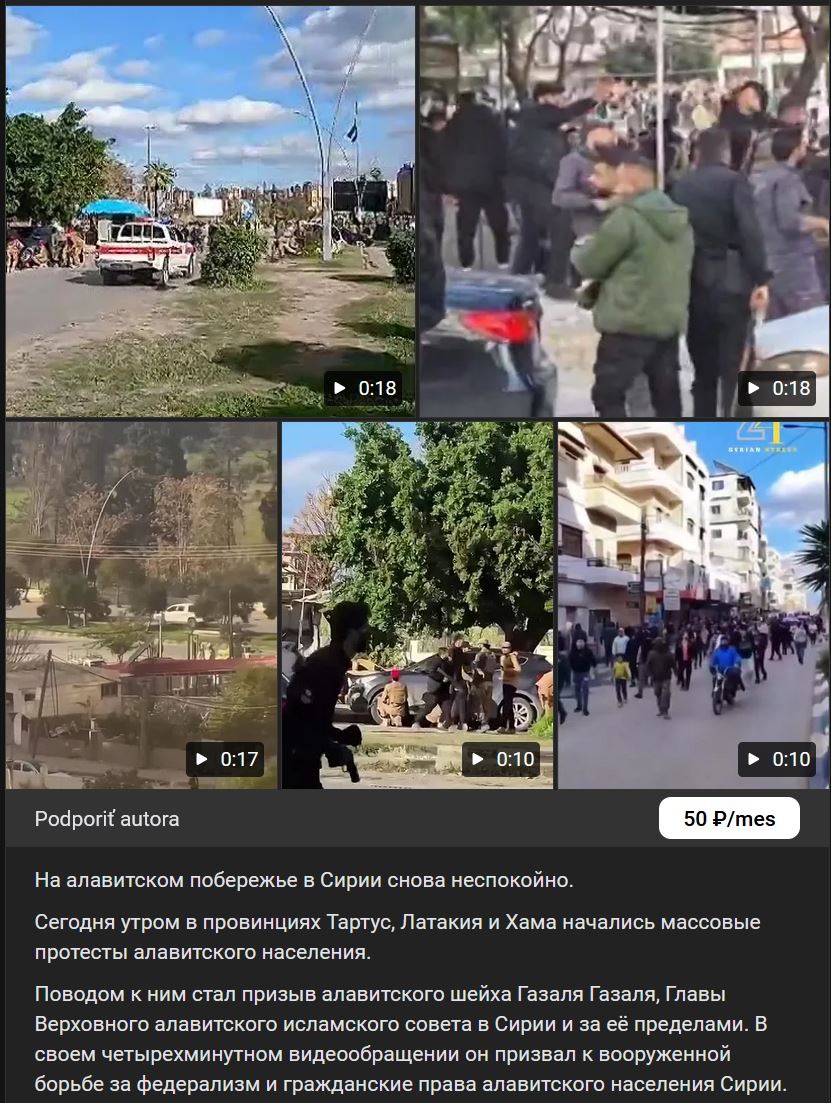 Zdroj https://www.teraz.sk/zahranicie/protest ... lanok.html z 28.12.2025Tisíce členov alavitskej komunity v nedeľu 28.12.2025 protestovali vo viacerých častiach Sýrie, 2 dni po bombovom útoku v mešite v meste Homs, ktorý si vyžiadal 8 obetí na životoch a 18 zranených. Sýrske pozorovateľské centrum pre ľudské práva (SOHR) tvrdí, že sýrske bezpečnostné zložky sa snažili rozohnať protesty, pričom zabili 2 osoby.
