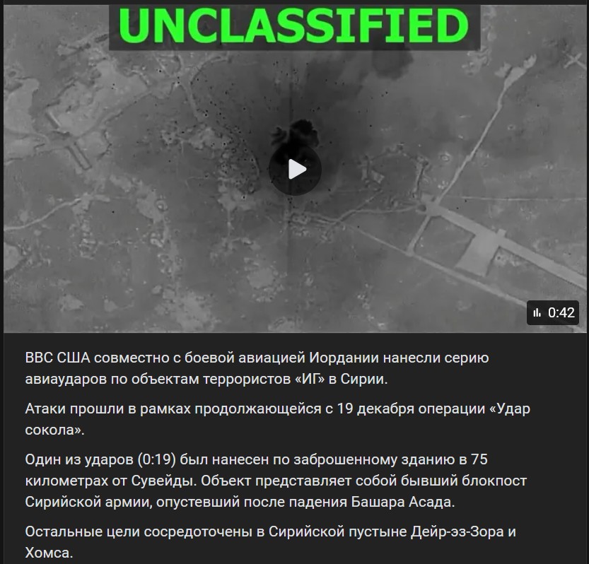 Video https://vk.com/video-123538639_456320387 dĺžka 42 sek.VVS SŠA spolu s bojovým letectvom Jordánska vykonali sériu leteckých úderov na objekty teroristov z IS v Sýrii.