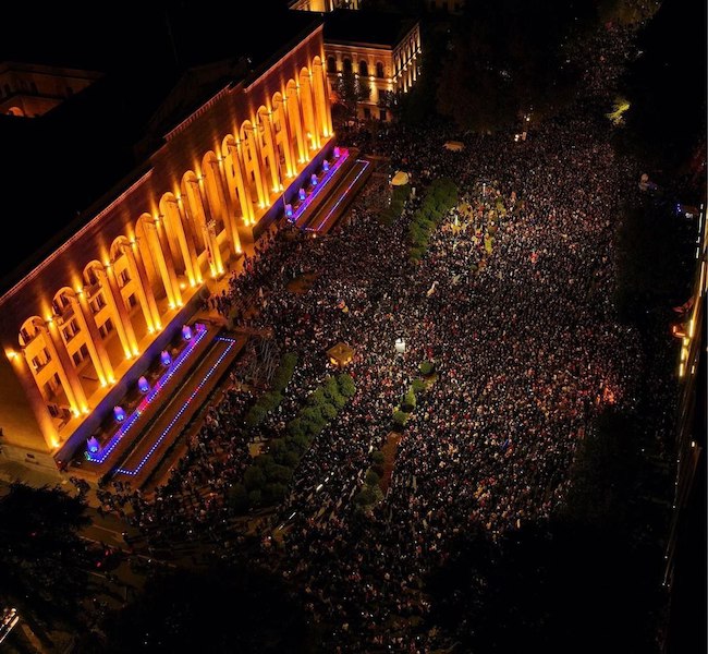Situace před budovou parlamentu v centru Tbilisi Prezidentka Salome Zurabišviliová včera v 19:00 oznámila (https://t.me/regnum_na/64936), že se zde koná velký protest nespokojenců s výsledky voleb. Představitelé opozičních stran, které prošly do parlamentu, v tuto chvíli přesvědčují západní velvyslance, že volby byly zmanipulované a jejich výsledky by neměly být uznány.